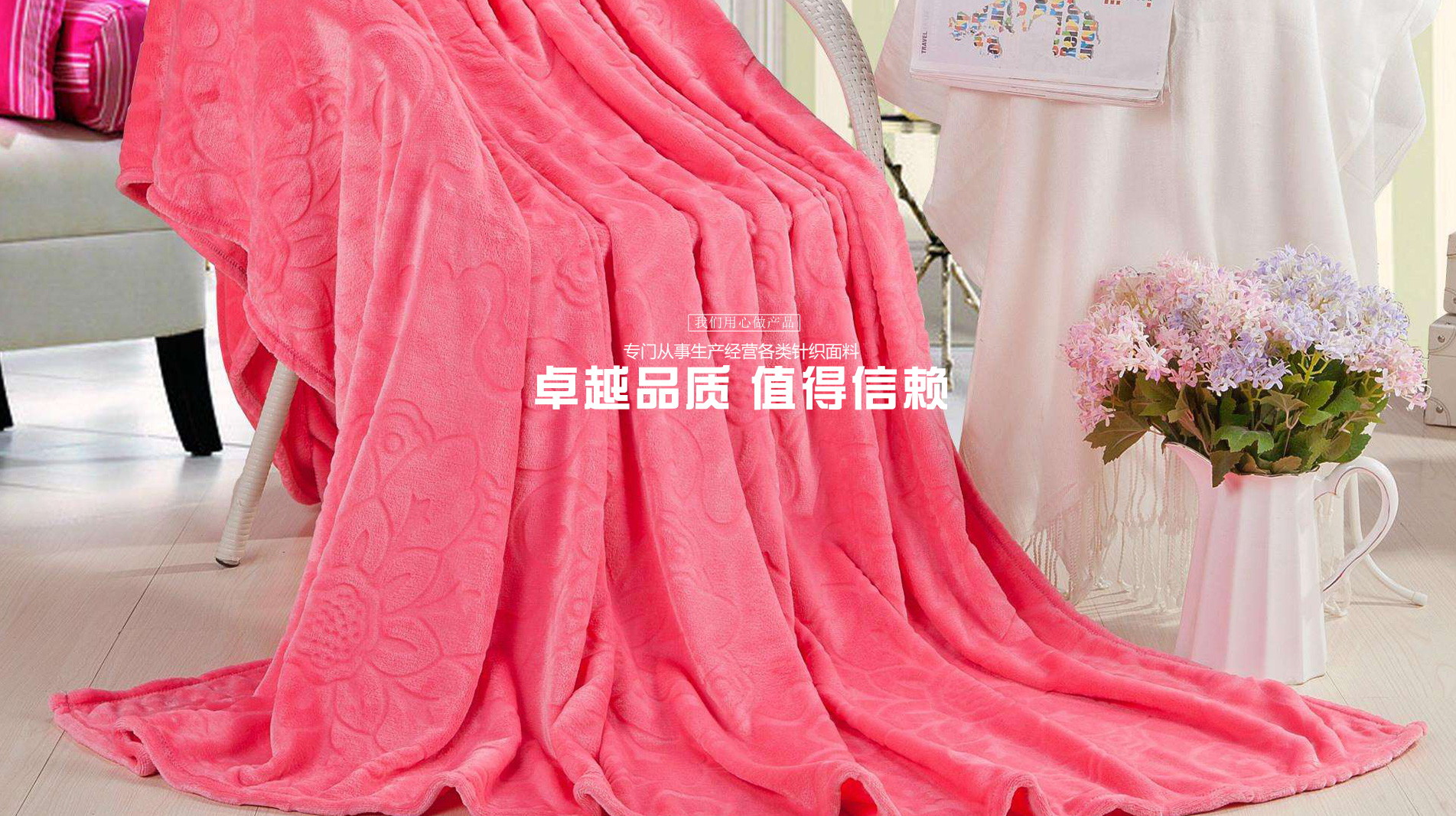 主要产品:法兰绒,珊瑚绒,超柔,PV绒,舒棉绒,全涤天鹅绒,CVC 80/20天鹅绒,不倒绒,毛毯等。